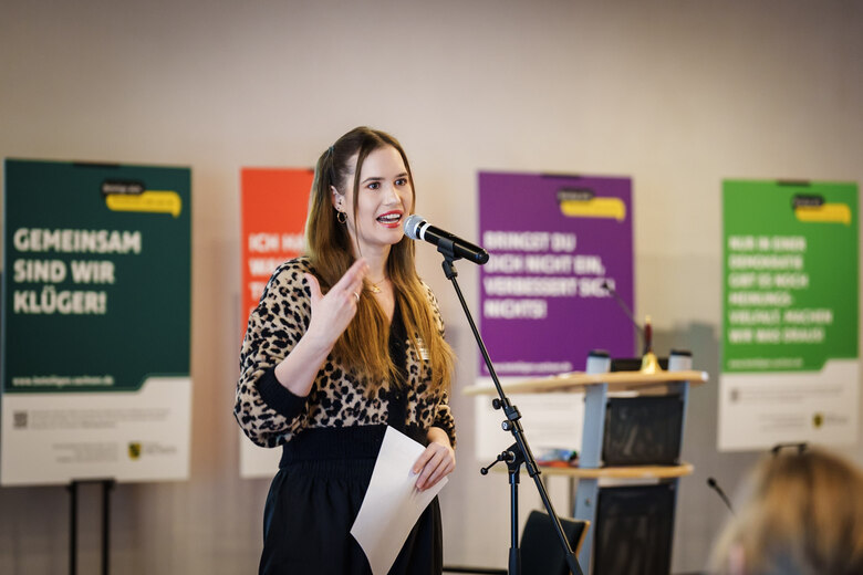 Demokratieministerin Katja Meier und Meißens Oberbürgermeister Olaf Raschke begrüßten die Anwesenden im Großen Ratssaal des Rathauses Meißen. Das Treffen versammelte wichtige Akteurinnen und Akteuren der Kinder- und Jugendbeteiligung aus ganz Sachsen – aus großen Städten und kleinen Gemeinden, aus dem zivilgesellschaftlichen Bereich und auch der kommunalen Verwaltung und Politik. Ministerin Katja Meier erinnerte in ihrem Impulsvortrag daran, dass derzeit gerade auch junge Menschen für Demokratie und Rechtsstaat demonstrieren: »Junge Menschen zeigen Gesicht gegen den Extremismus und gegen den Hass, setzen ein Zeichen für Vielfalt, für friedlichen Zusammenhalt, und für die weltoffene Gesellschaft, in der sie gern zuhause sein wollen«, sagte sie. »Dieses Engagement spricht eine deutliche Sprache. Sie zeigen uns deutlich, wie groß ihr politisches Bewusstsein ist, und dass sie sich um unsere Lebensgrundlagen und unsere Demokratie sorgen.« Kinder- und Jugendbeteiligung sei darum ein wichtiger Standortfaktor, betonte sie: »In Zeiten des demographischen Wandels trägt Selbstwirksamkeit dazu bei, dass sich junge Menschen stärker mit ihrer Heimat-Region identifizieren. Wenn die Kommunen also entscheiden, junge Menschen stärker zu beteiligen, dann stärken sie sich damit langfristig auch selbst.«